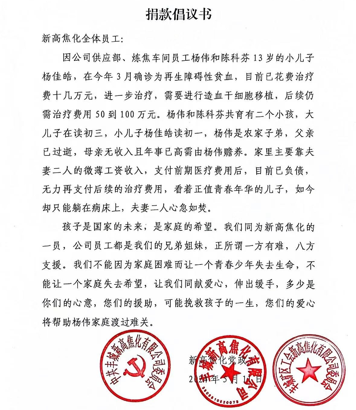 一方有難 八方援助——新高焦化、天壕新能源公司共同為患重病員工孩子捐款